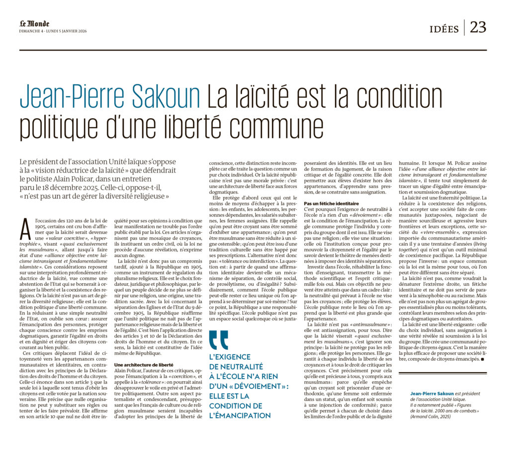 Il y a 120 ans, le 9 décembre 1905, les parlementaires français adoptaient la loi de séparation des Eglises et de l’Etat instaurant la laïcité. Une loi aujourd’hui poussée dans ses retranchements par divers acteurs communautaires, politiques ou religieux. Farouche défenseur de la loi de 1905, Jean-Pierre Sakoun préside l’association Unité Laïque. Il a également été l’initiateur et président du comité pour l’entrée du résistant communiste arménien Missak Manouchian au Panthéon, en 2024.